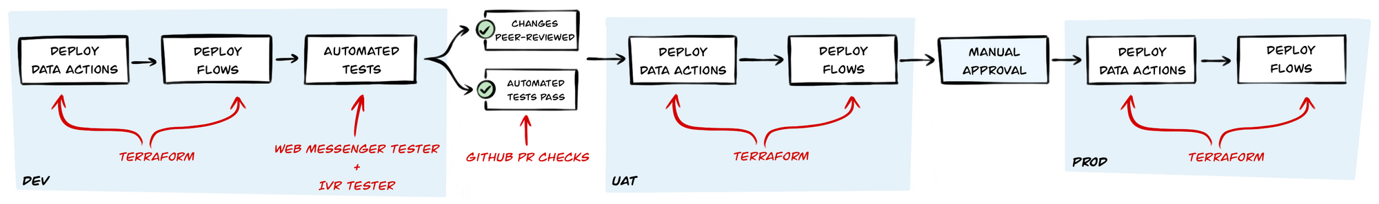 Since many providers support Terraform we can define everything in one place; from bots, flows, data-actions to their backend services. Here's an example of a Terraform definition: