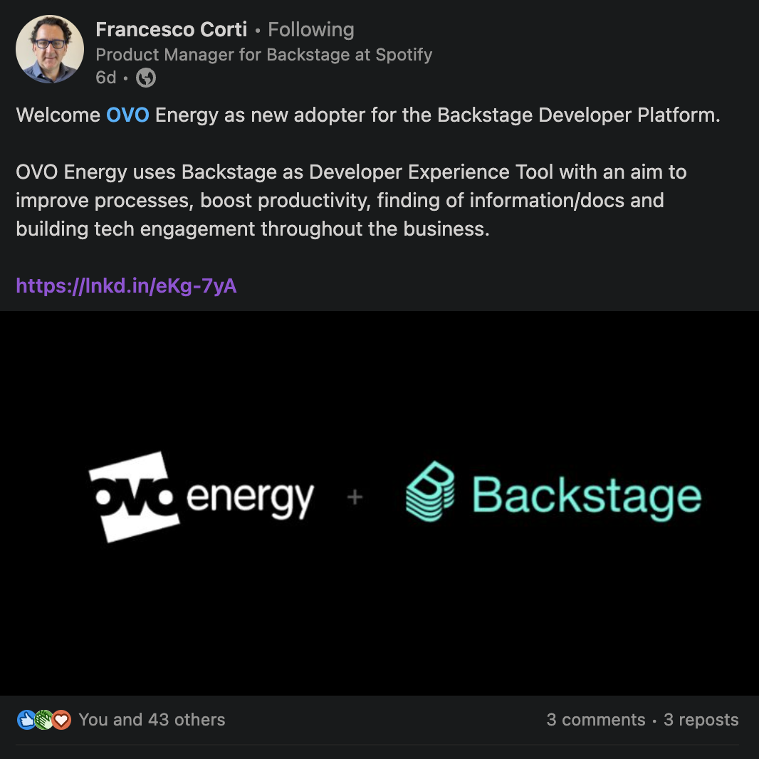 One example of this would be our adoption of Spotify's open-source developer portal Backstage, with the aim to help teams manage and maintain the software, services or libraries they own and make them discoverable for everyone. We are in the early stages but are very excited about the potential this tool has, and how we can make it work for us and ultimately help to reduce the cognitive load of our engineers.
